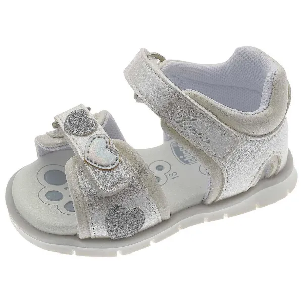 - Sandalo Primi Passi Da Bambina A Punta Aperta In Materiale Laminato Con Applicazione Di Cuori In Colore Argento, Regolabile Con Doppio Velcro