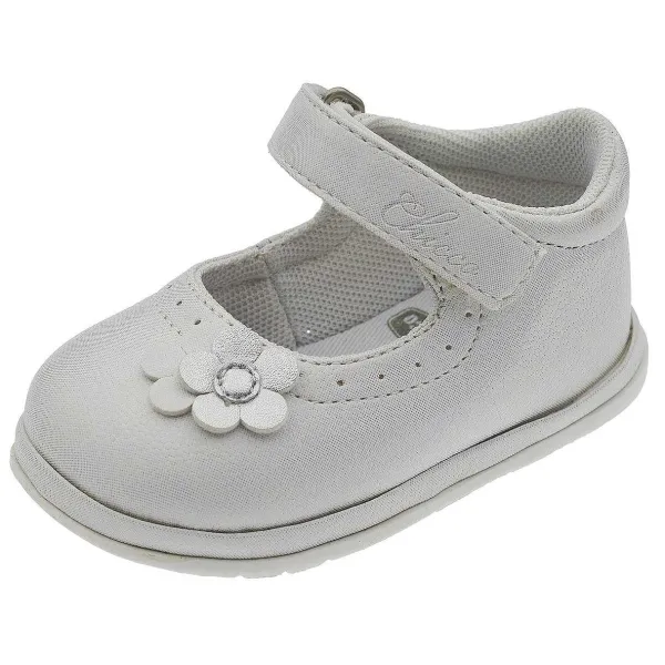 - Ballerina Primi Passi Da Bambina In Materiale Bianco Iridescente Con Fiori Applicati. Cinturino Regolabile Con Velcro