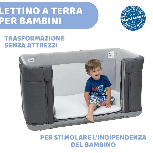 - Lettino A Terra Di Ispirazione Montessoriana: Dai 18/24 Mesi È Possibile Rimuovere Le Gambe E Aprire Completamente Una Delle Sponde Per Lasciare Il Bambino Libero Di Entrare Ed Uscire.