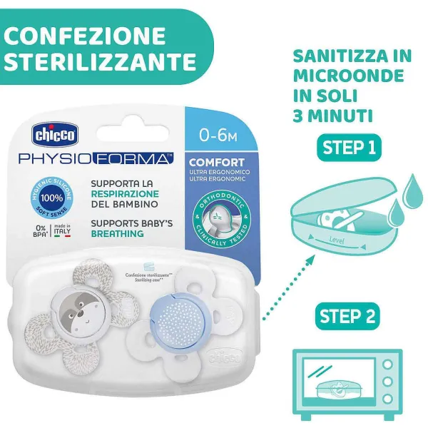 - Il Succhietto Physioforma Comfort 0-6M In Silicone Di Chicco Grazie Alla Sua Forma Ergonomica Con Soli 4 Punti Di Contatto Offre La Massima Dolcezza Sul Viso Del Bambino.